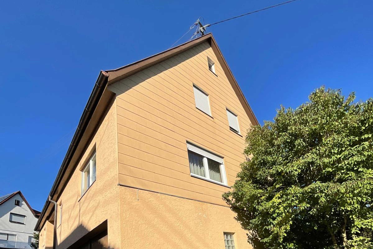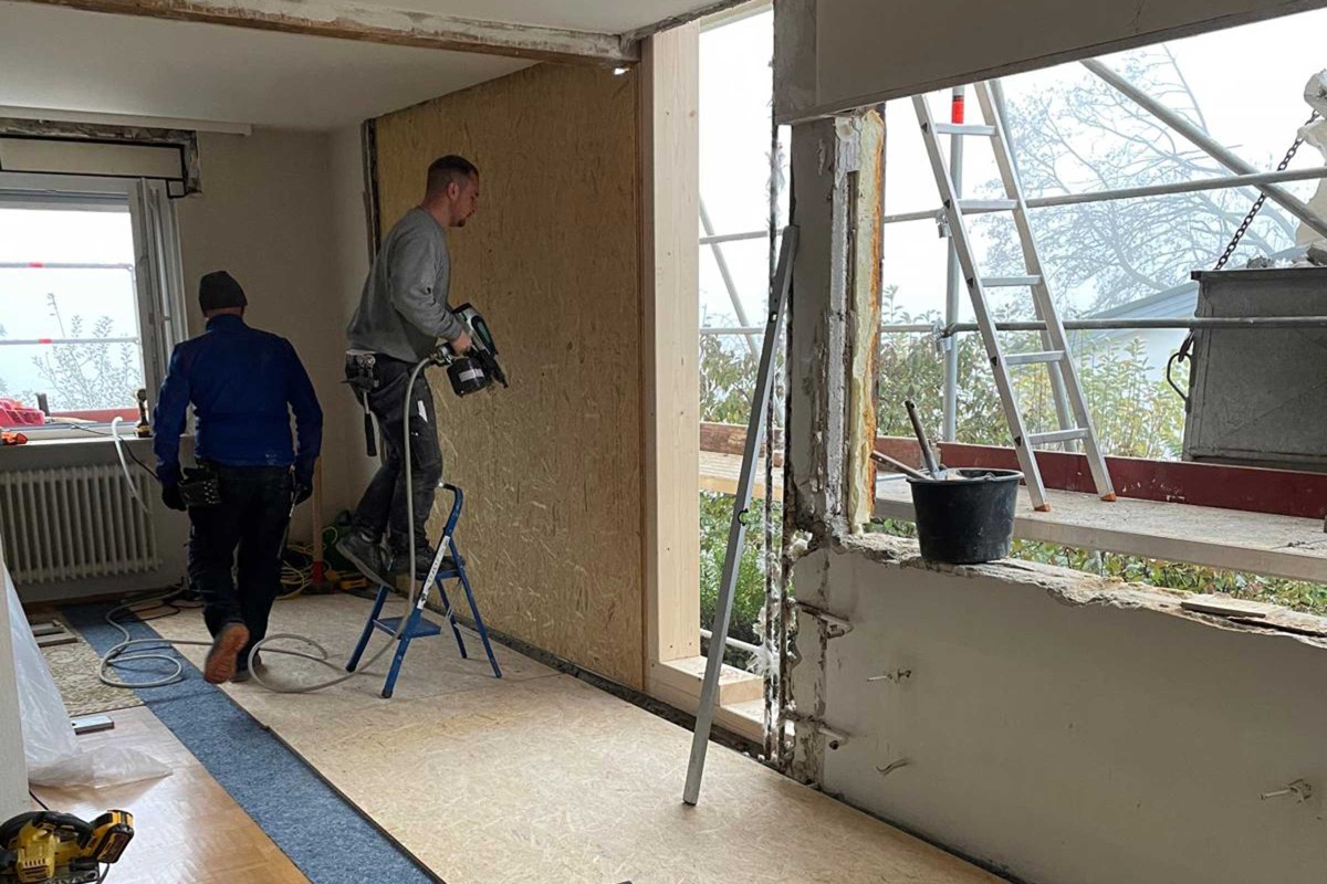 Im Zuge dieses Projekts in Rosenfeld stellte sich bei der Bestandsaufnahme heraus, dass sich unter der alten Faserzementverkleidung über Jahre hinweg Feuchtigkeit gesammelt hatte. Die daraus resultierende Fäulnis hatte die tragende Fachwerkkonstruktion des Giebels massiv beschädigt – teils bis in den vollständigen Querschnitt einzelner Rahmen und Träger. Eine Sanierung war an dieser Stelle nicht mehr möglich, weshalb der komplette Giebel abgebrochen und fachgerecht neu aufgebaut wurde.