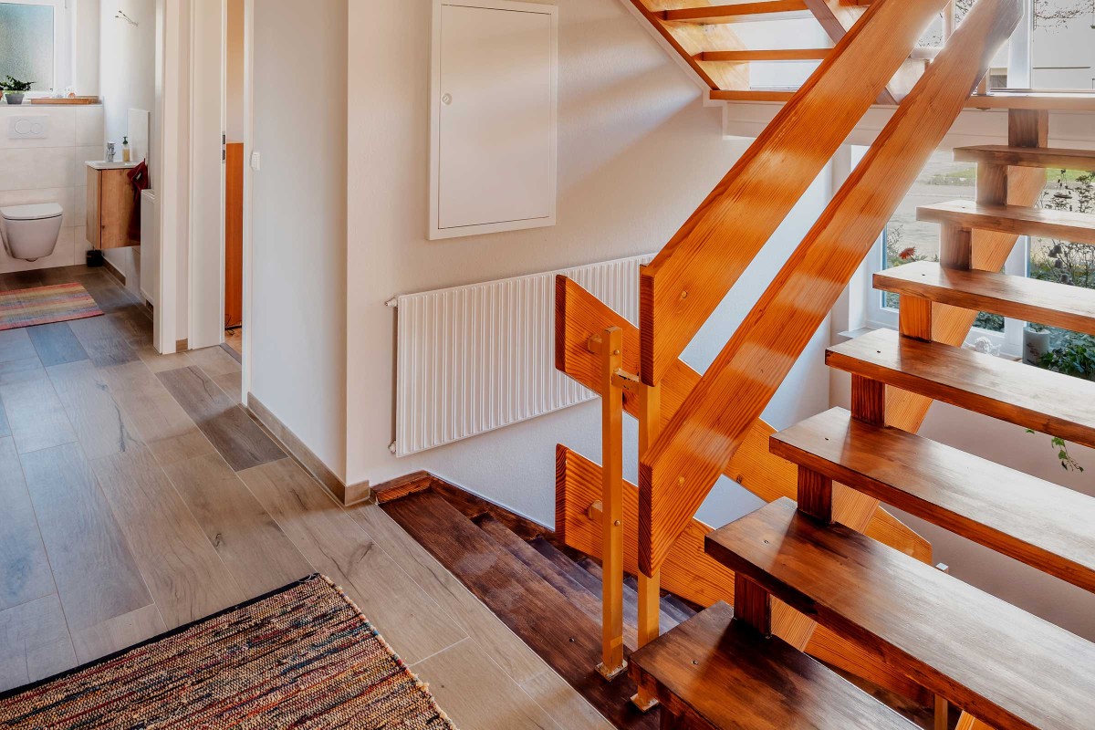 Die alten Glasbausteine wurden durch ein großzügiges Fenster ersetzt, wodurch mehr Tageslicht in den Treppenraum gelangt. Der bestehende Kamin wurde saniert und durch einen modernen Holz-Kaminofen ergänzt – für gemütliche Stunden mit effizienter Wärme.